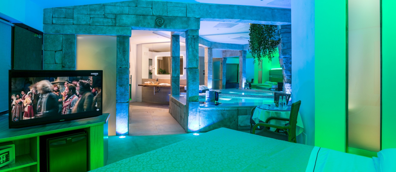 | Benessere | Piscina Idromassaggio con cascata e coreografia rocciosa, sauna, doccia con effetto emozionale e con aromaterapia, tavolo da 2 per piccola ristorazione, effetto sonoro in diffusione, cromoterapia nella suite |